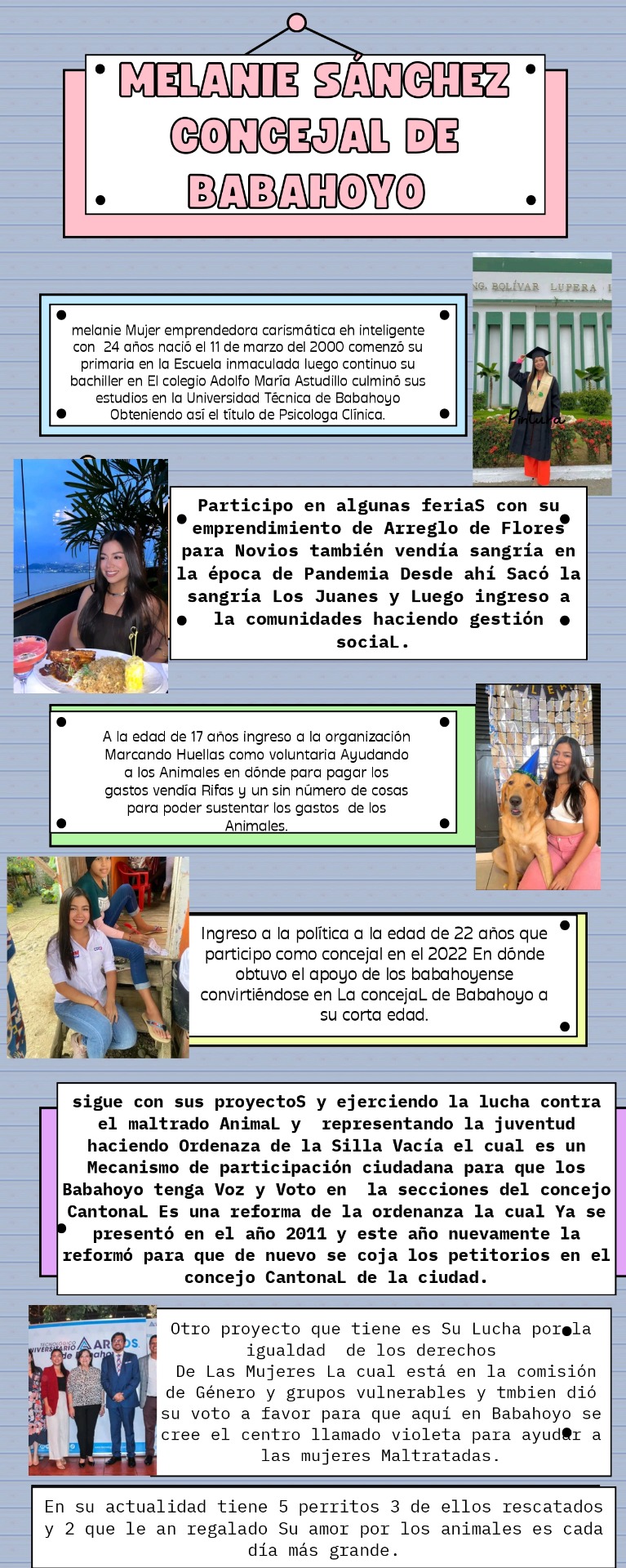 Melani Sánchez la joveven activista por los derechos animales, activamente sube contenido a sus redes sociales sobre su gestion como concejal de Babahoyo. Hoy, esta figura publica que representa el empoderamiento de jovenes y mujeres, nos permite conocer un poco mas allá de su vida en una entrevista para Visión Digital.